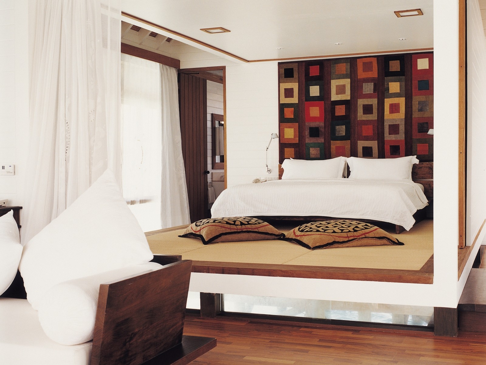 Rooms are inspired by local dhoni boats in bleached wood with kajan roofs. They are reached via planked walkways stretching out in the warm lagoon.