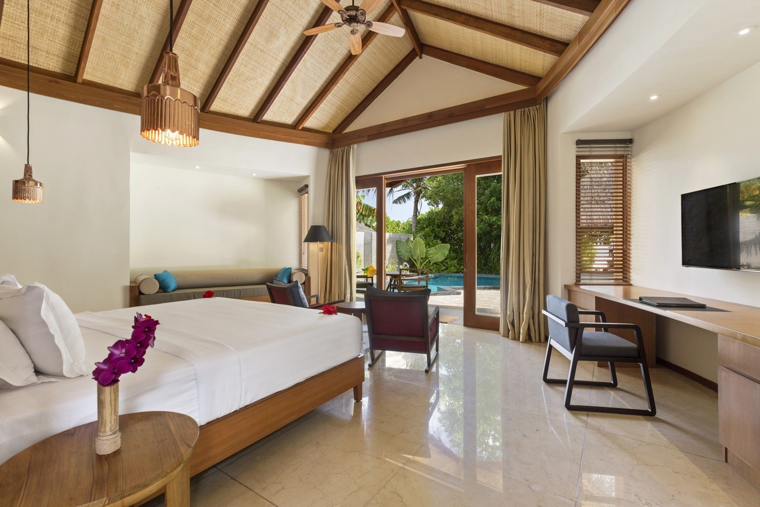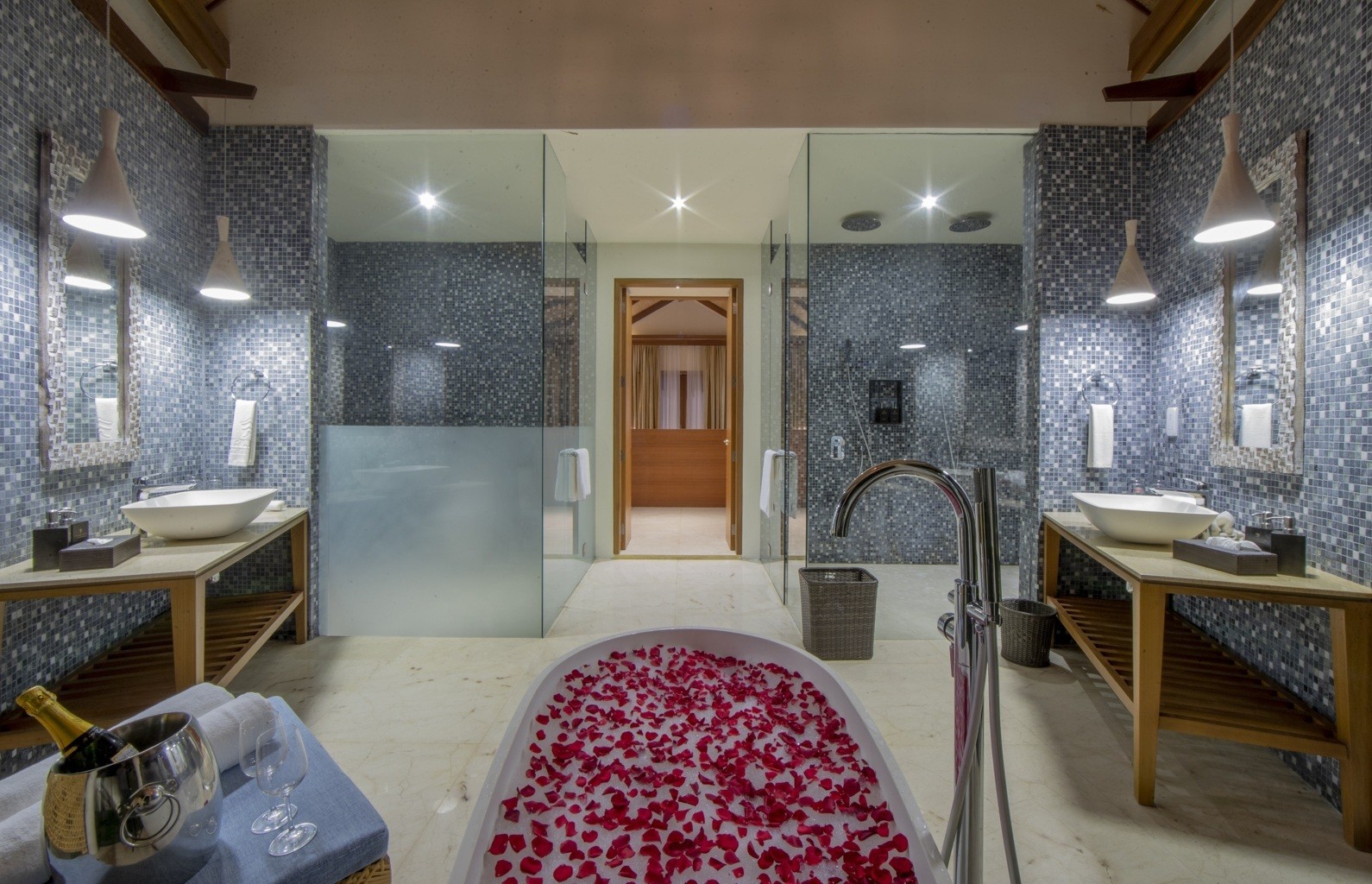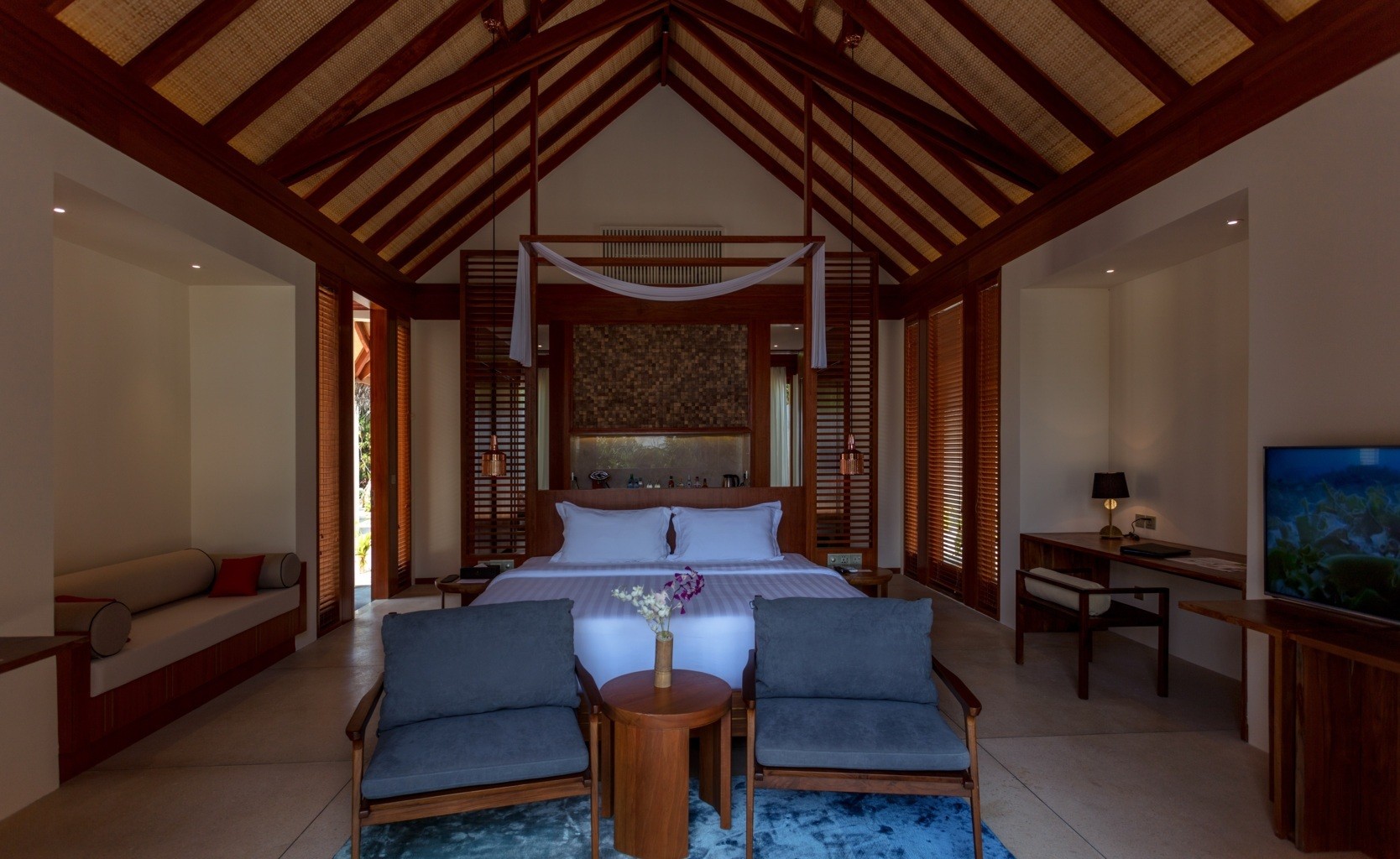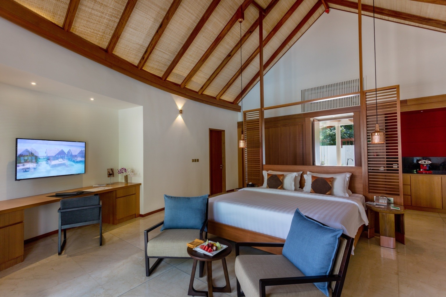 The 107 private villas have been specifically de-signed to meet guests’ individual preferences and are set among lush vegetation, in the first row on a powdery white beach or settled above a turquoise sparkling lagoon nearby the house reef.
