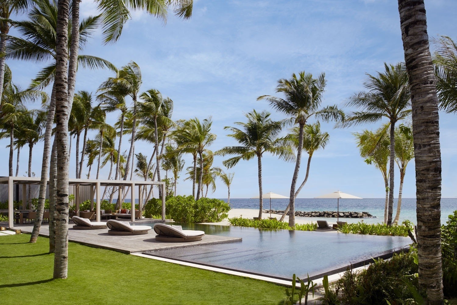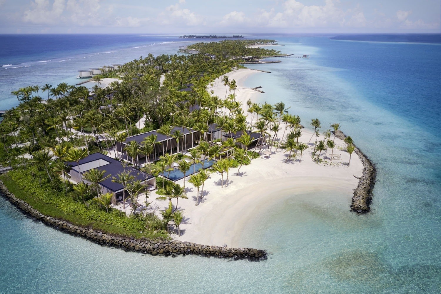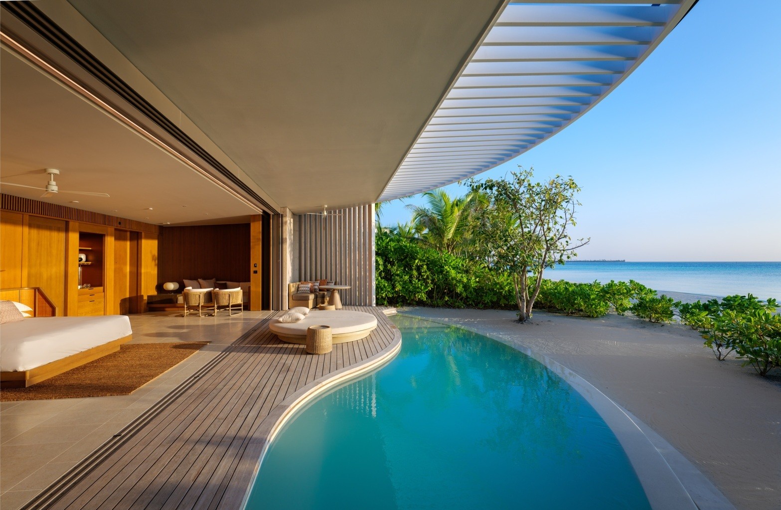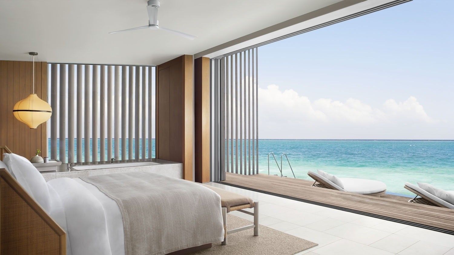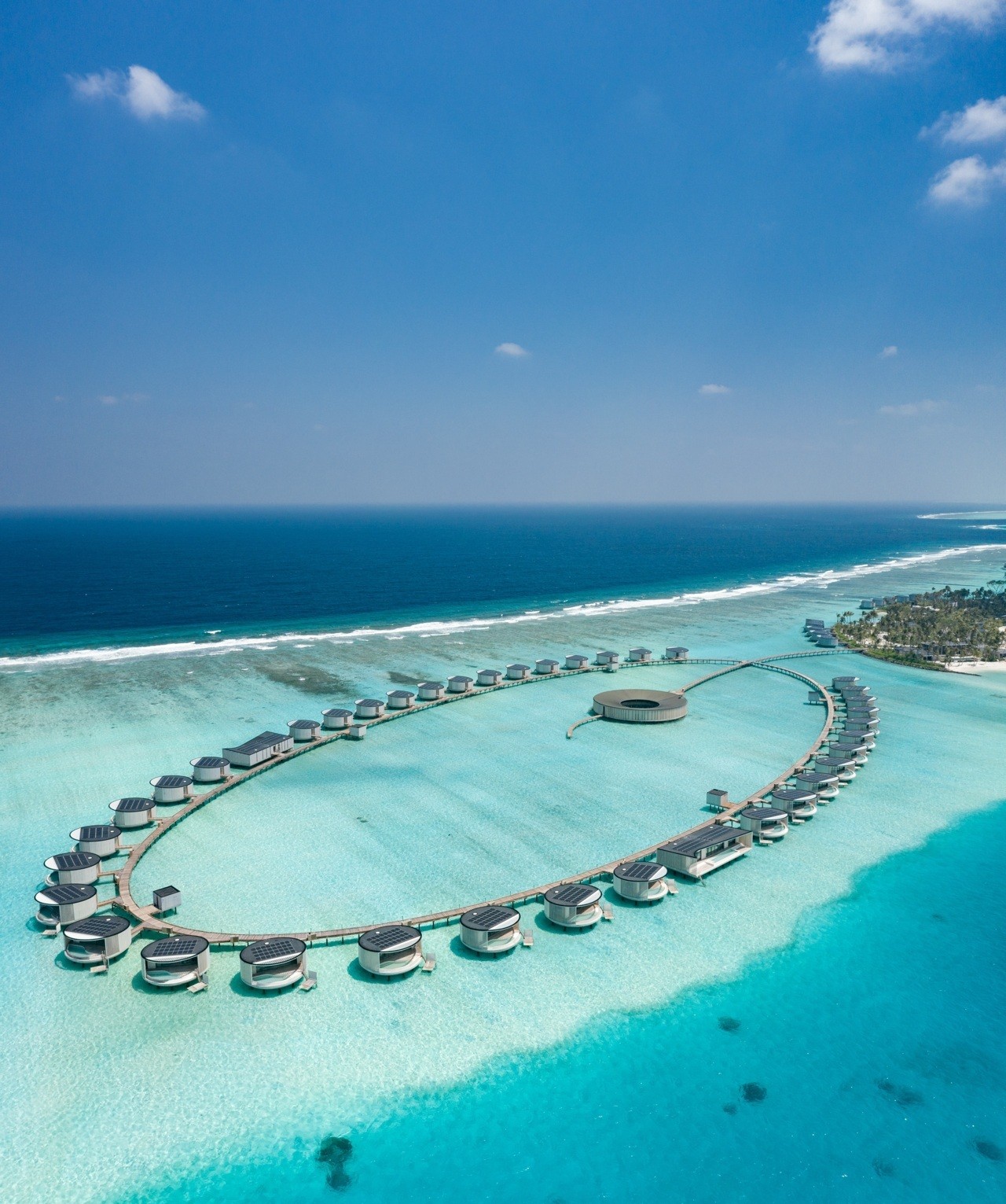 The 13.5-hectare resort presents 100 elegantly designed villas by Kerry Hill Architects, nestled overwater or on the beach are inspired by the ocean forces, wind and waves. Indoor and outdoor spaces, each villa offers a private pool, sundeck, ensuite bathroom and a lavish collection of personalised amenities.